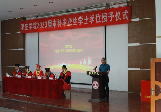 伴随着庄严的国歌,毕业典礼正式拉开帷幕。学生工作处副处长杨伟宣读了《枣庄学院学位评定委员会关于授予毕研珂等263名同学学士学位的决定》。