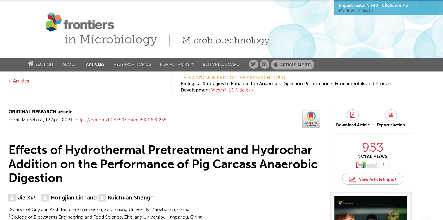 近日,YABO鸭脖官网固废资源化综合利用科研小组在水热炭调控厌氧消化研究方面取得最新进展,相关工作发表在国际著名期刊《Frontiers in Microbiology》(中科院一区,TOP期刊,影响因子5.640)上,论文题目为《Effects of hydrothermal pretreatment and hydrochar addition on the performance of pig carcass anaerobic digestion》,枣庄学院为第一单位,徐杰博士为论文第一作者。
