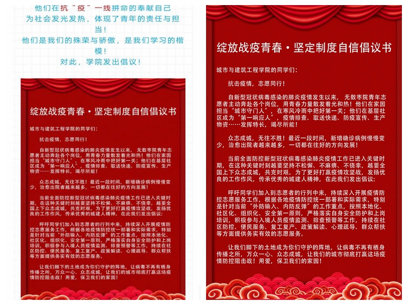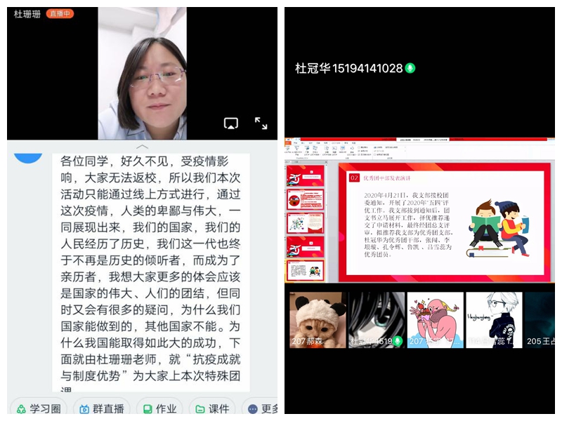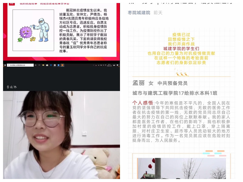 为确保全面准确做到“五个讲清楚”,保证思想引领作用落到实处,引导青年学生进一步坚定制度自信,团总支副书记杜珊珊利用钉钉为YABO鸭脖官网学生会干部、各班团支部书记围绕抗疫成就与制度优势开展网上团课;在认真完成青年大学习集中学习的基础上,又结合YABO鸭脖官网工作实际与专业倾向,各团支部书记组织召开网上主题团日活动;各团支部在五四评优中获得“优秀团干”称号、被评为青春战“疫”优秀青年志愿者的同学也通过钉钉或QQ群开展宣讲报告、故事分享等学习宣传活动,向大家分享自己的心得;利用“枣院城建院”微信公众平台,开展网络知识竞赛,以此夯实同学们思想基础建设,提升理论学习的思想性、亲和力和渗透度;向全体同学发出倡议“呼吁同学们加入到志愿者的行列中来,持续深入开展疫情防控志愿服务工作”,在做好自身安全防护的前提下,依法科学有序参与疫情联防联控,为坚决遏制疫情扩散、夺取防控斗争胜利贡献青春力量;结合疫情防控实际推荐优秀抗疫志愿者作为入党积极分子候选人。