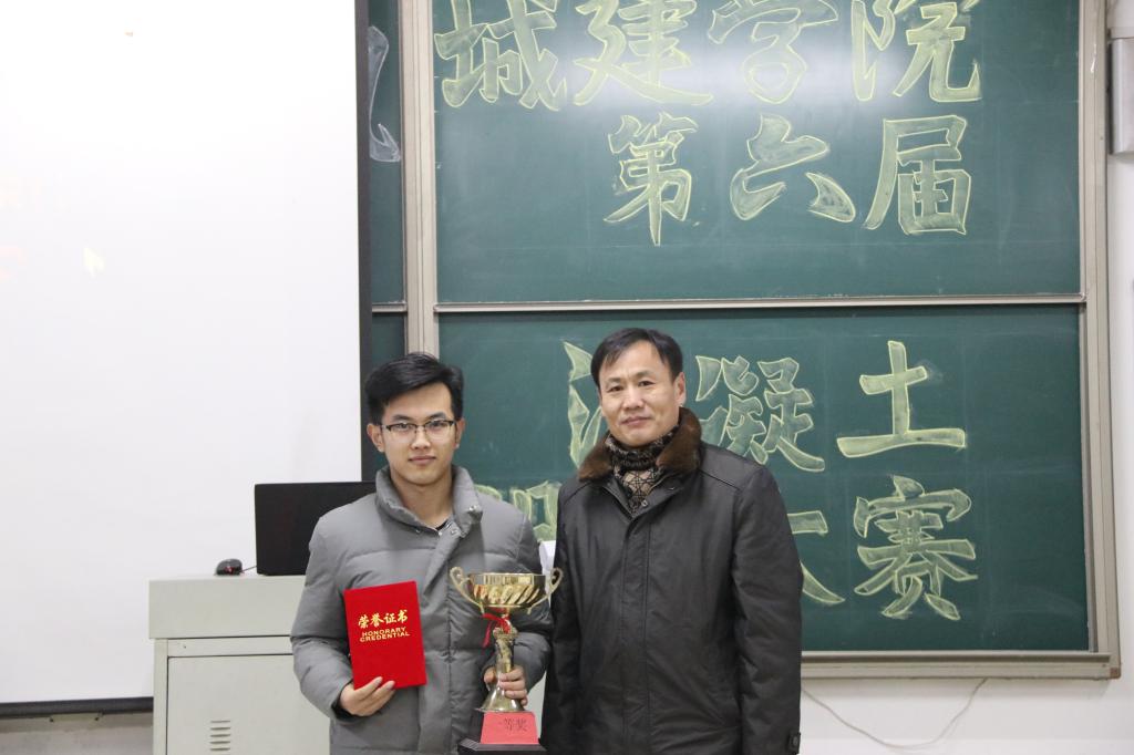 本次大赛的主题为“轻质与高强”,一共18个参赛小组,每个小组有三分钟的时间以PPT的形式讲解小组混凝土配合比的设计思路以及材料的选取和用量,还有两分钟的回答时间,由评委随机抽取组内成员回答相关专业问题,最后根据每组的设计思路,试件强度以及问答情况给予分数,比赛如火如荼的进行,每一组的成员都积极参与,用心准备,发挥出了他们的专业水平。历经激烈角逐后,大赛共评出一等奖一名,由十四组获的,二等奖两名,三等奖三名,最后比赛圆满结束。