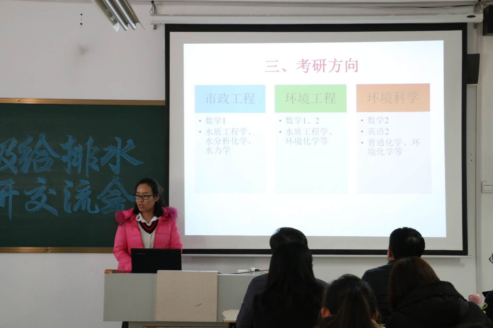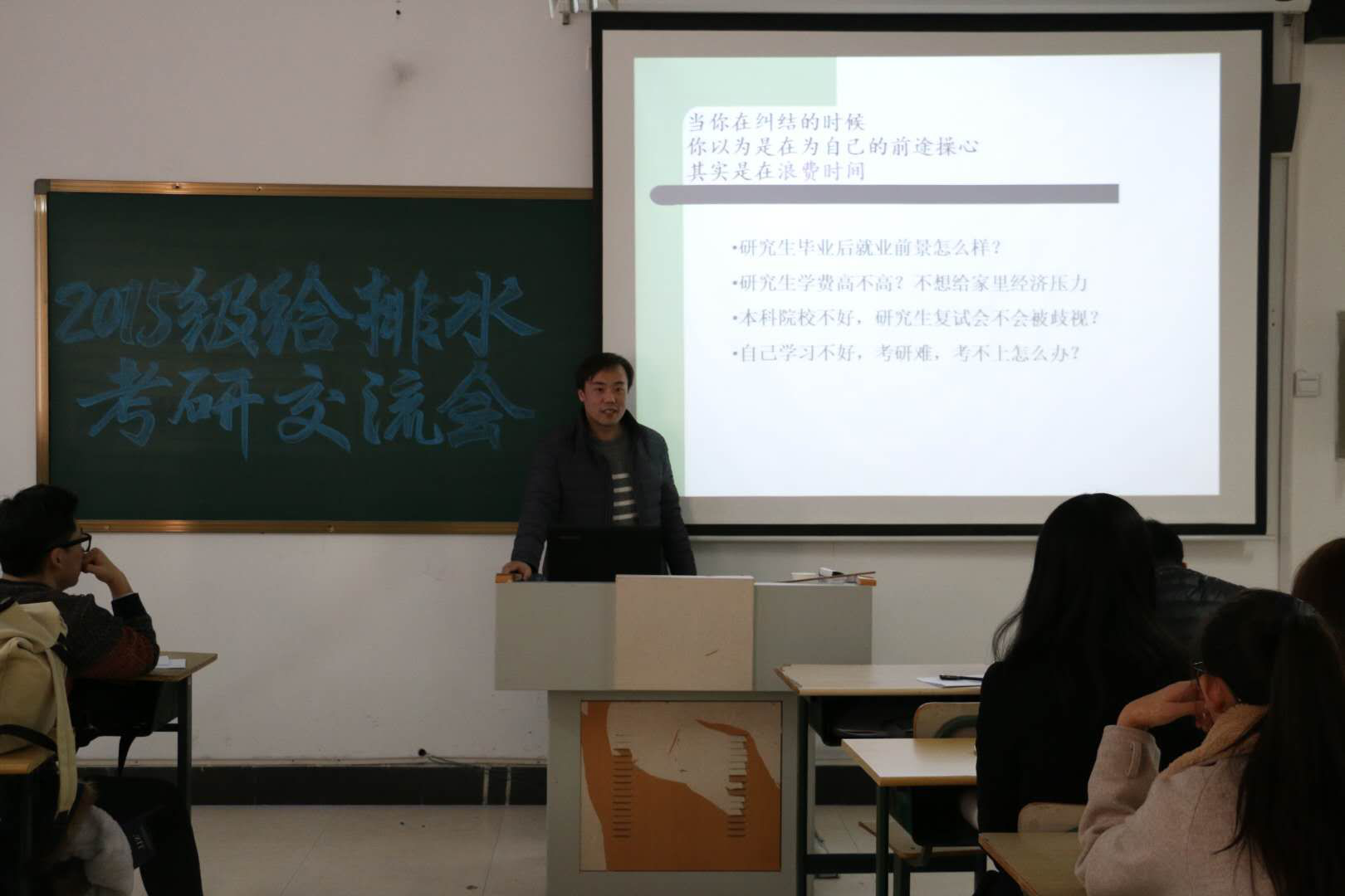 齐金秋老师主要从为什么考研、如何备考以及考研方向的选择三个方面进行介绍,对备考过程的时间规划、考研资料的获取等内容技巧进行了总结,刘彬老师重点介绍了备考的时间流程,从最初的研究生招生信息网上进行择校、择专业,到网上报名、现场确认,初试、查分以及调剂等流程进行梳理,对本专业考研的四门课程数学、政治、英语以及专业课的复习思路和技巧进行总结,并提出考研是一个漫长的备战过程,合理的目标,科学的复习计划以及自我鼓舞是非常重要的。庄文博士主要从专业的选择以及自身的兴趣爱好相结合进行介绍,他提出不能过分看中专业名称,自身的能力与兴趣爱好才能决定自己在科研的道路走的多远。