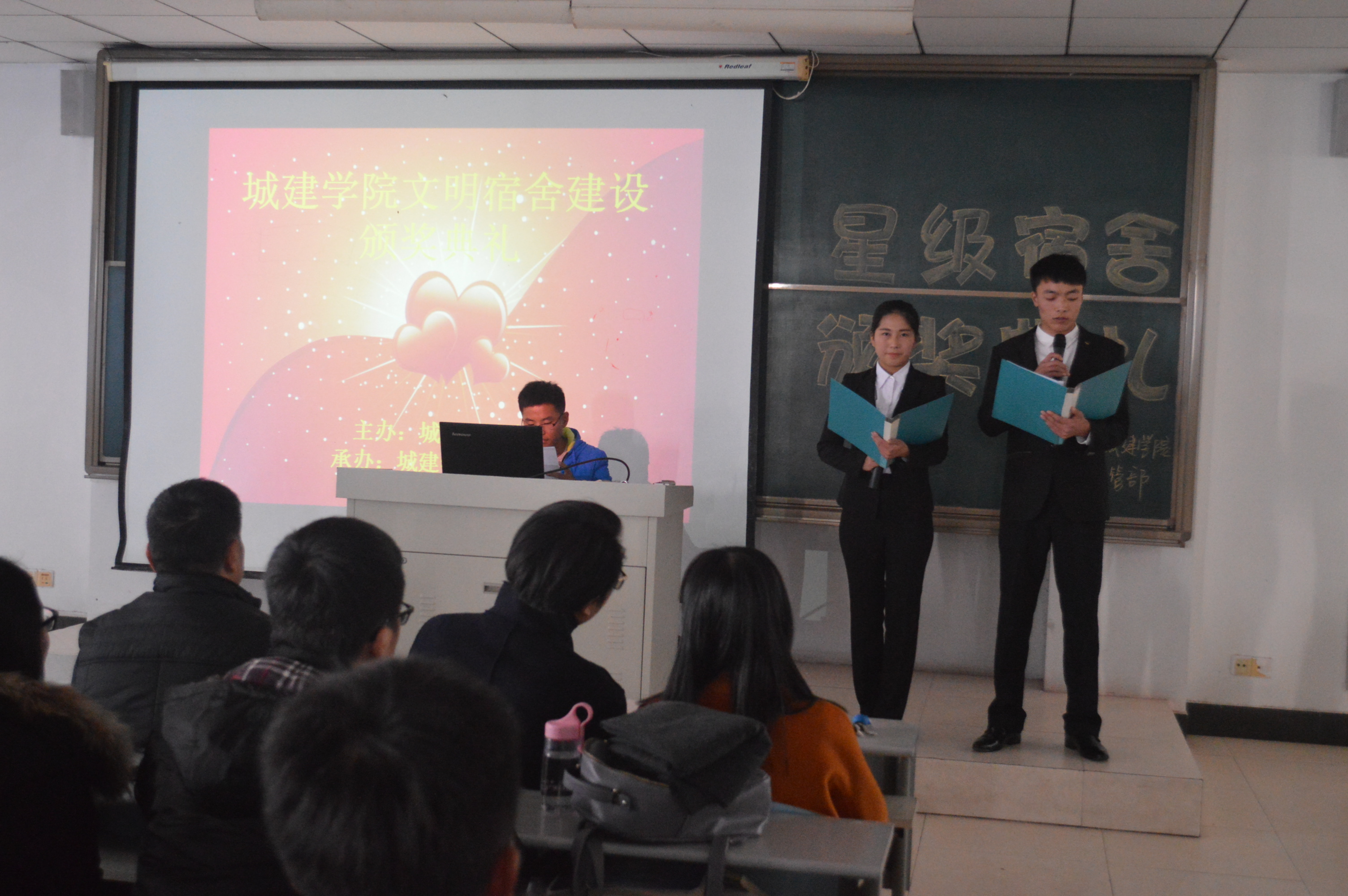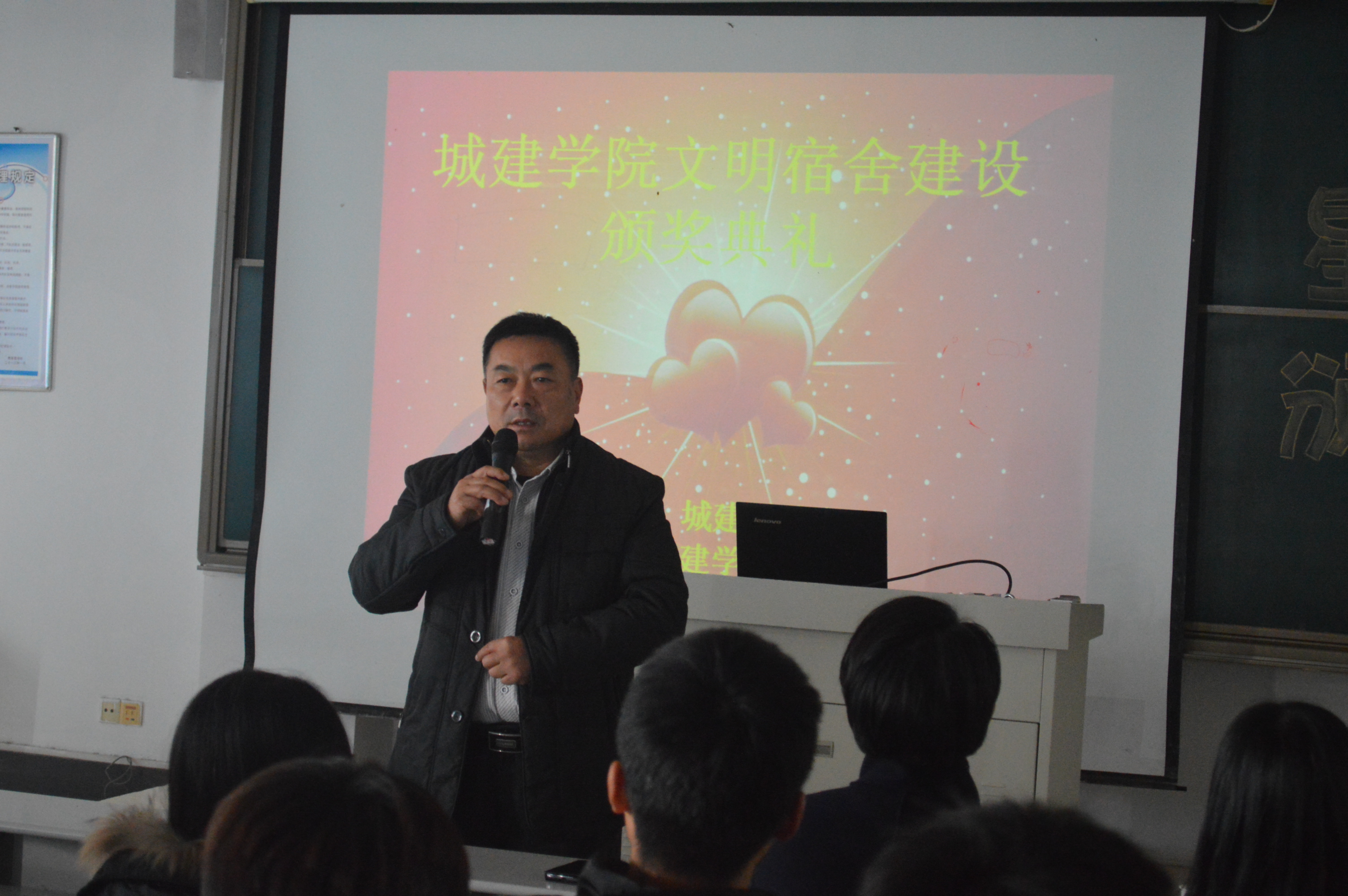 11月23日下午,YABO鸭脖官网在理工楼2505成功举办以“构建和谐宿舍,携手温馨校园”为主题的宿舍文化节颁奖典礼,党总支书记宋博、全体辅导员、学生干部以及2016级全体学生参加了此次典礼。