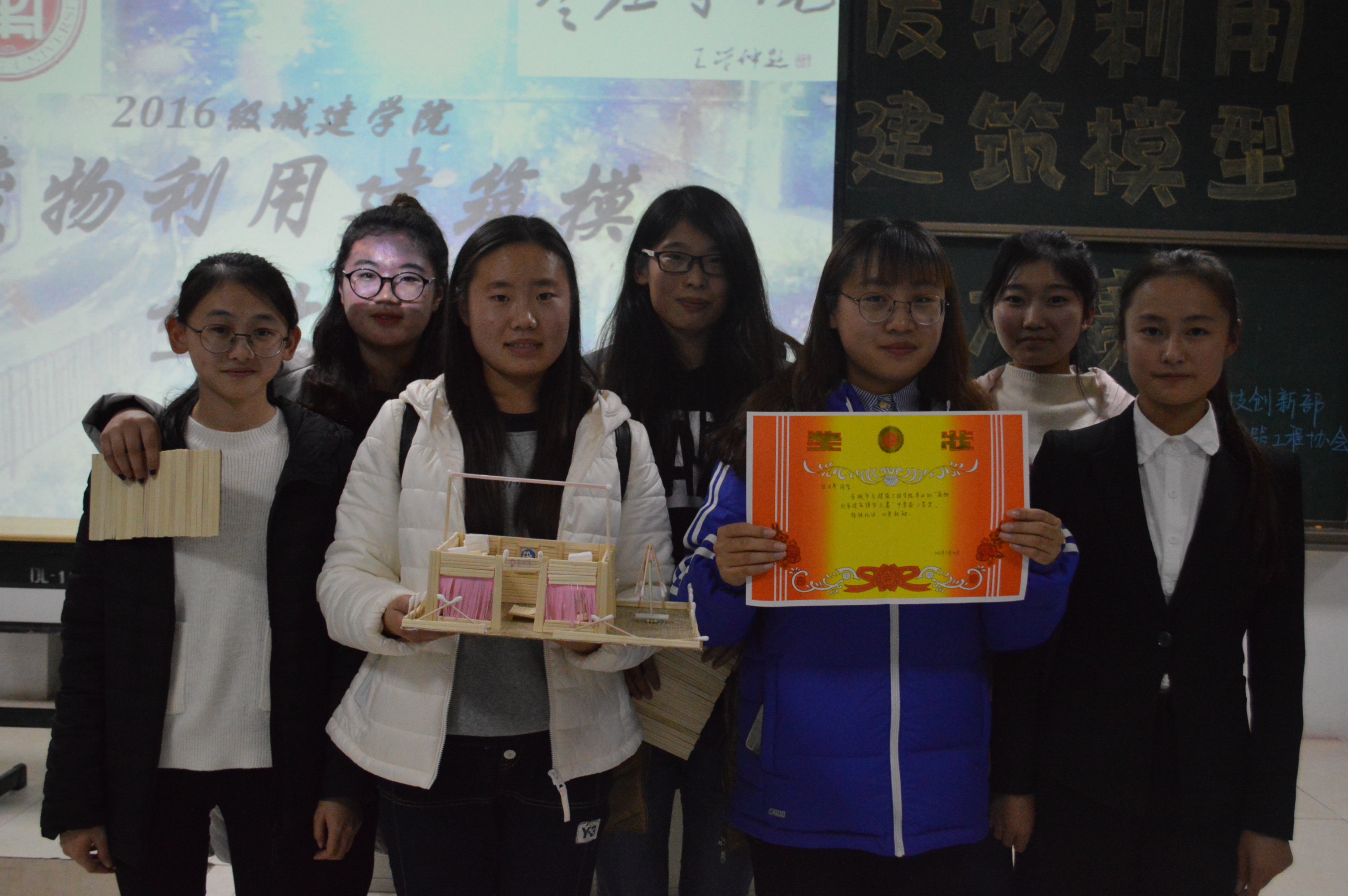 比赛伊始,主持人介绍了本次比赛的理念和特色,即“废物利用,环保创新”,充分利用生活废弃物,集创新于一体,构建具有实用性或观赏性的建筑模型。比赛中,各个参赛团队都自信满满、充满激情的在讲台上介绍各自独具匠心的建筑模型,每一件作品都是团队智慧与汗水的结晶,更是理论知识与创新能力的见证。其中,来自于15土木工程2班的张春峰带来的《摩天轮》吸引了所有在场的评委和观众的目光,它光滑而干净的外观展现出了它独特的风采。作品《天使之翼》以它鲜艳的颜色和独具的创意将比赛推向高潮,活跃了现场的气氛。经过现场各个参赛团队的展示和讲解,作品《摩天轮》获得一等奖,《辽宁舰》和《天使之翼》斩获二等奖,更有多个团队获得三等奖和优秀奖。