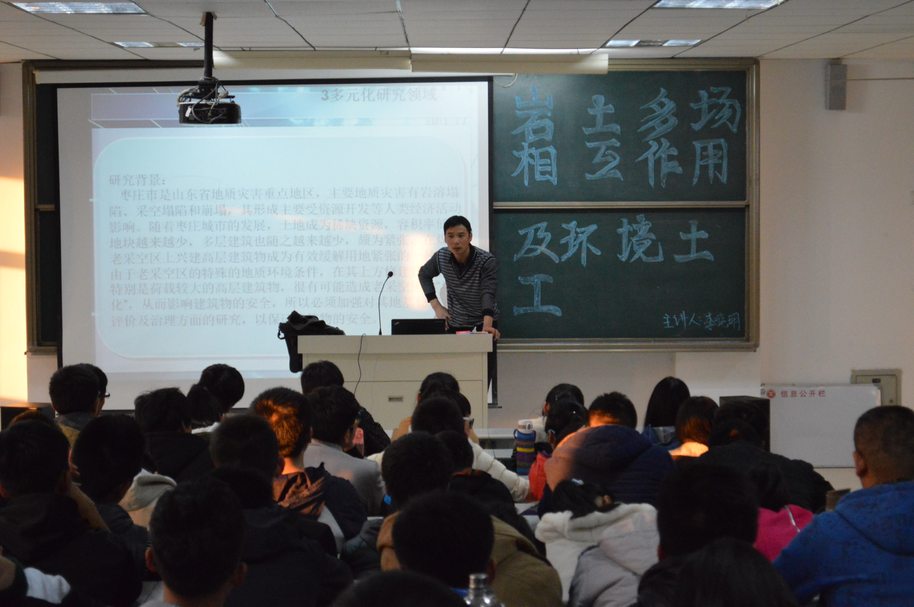 报告会上,李晓明老师首先通过播放图片及视频,向同学们介绍了岩土工程多场的含义以及作用,用典型而又生动的事例阐述了岩土多场出现的必要性。强调岩土体与大气、水、生物、化学等相互作用,其研究方法和手段的多样化,以及与岩土工程、环境工程、地下水工程等学科交叉与合作。最后,李老师指出:我们应该把重点放在“废弃泥(渣)的工程特性、工程处置及资源化利用”、“固体废弃物填埋场液气产生及运移”、“地下水土污染评价、控制与修复”、“固体废弃物堆场变形与稳定”和“城市固体废弃物填埋场与大气相互作用与覆盖系统”等方面的学习。李老师的报告深入浅出,精彩纷呈,博得了在场师生的热烈掌声。