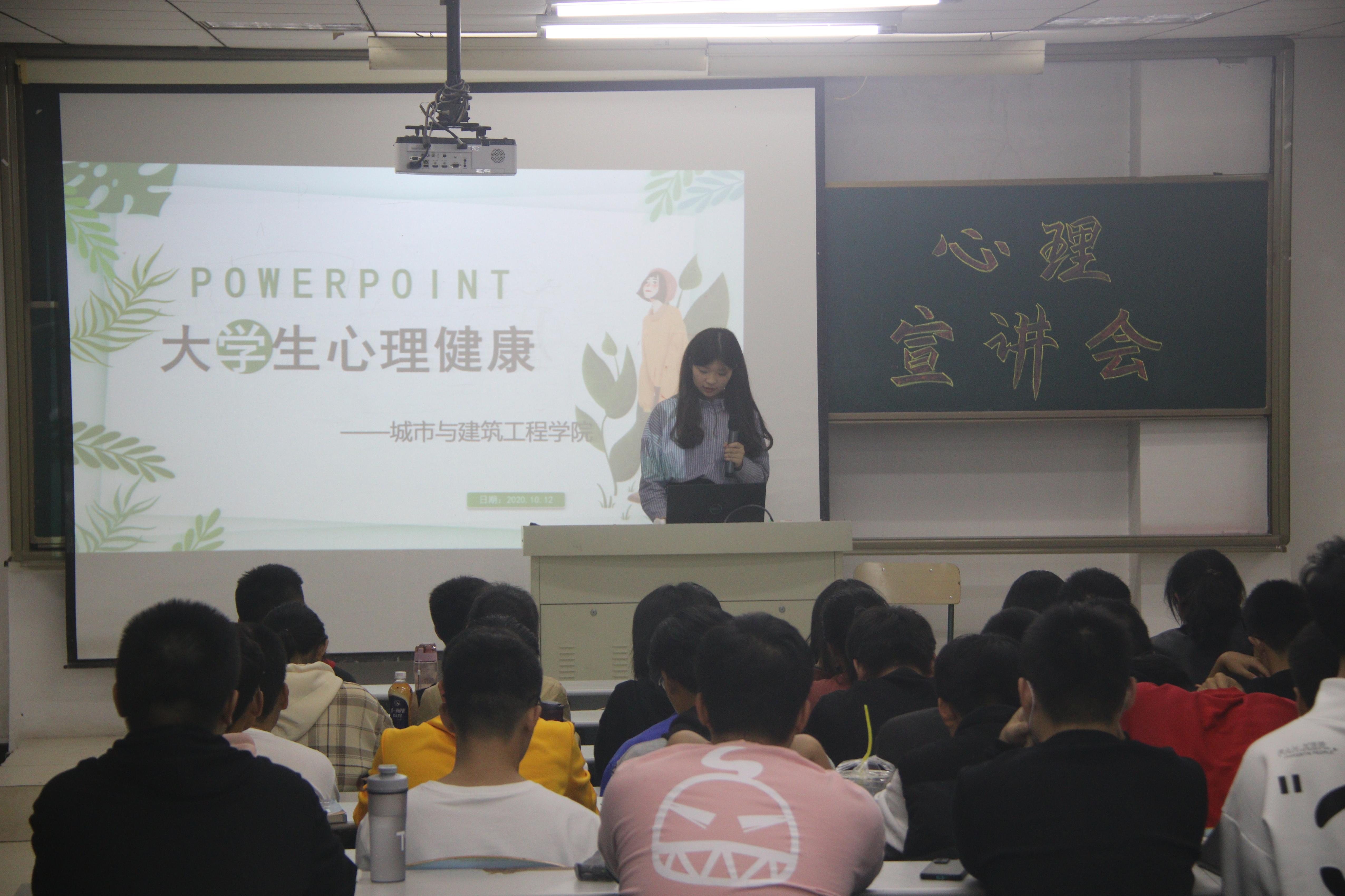 为更好的宣传与普及心理健康知识,使学生意识到心理健康的重要性,营造一种积极关注个体成长、自觉维护心理健康的校园氛围,提升新生的心理素质和班级凝聚力。YABO鸭脖官网于10月12日晚上19:00在理工楼2505组织召开大学生心理健康宣讲会,2020级全体学生参加了本次宣讲会。