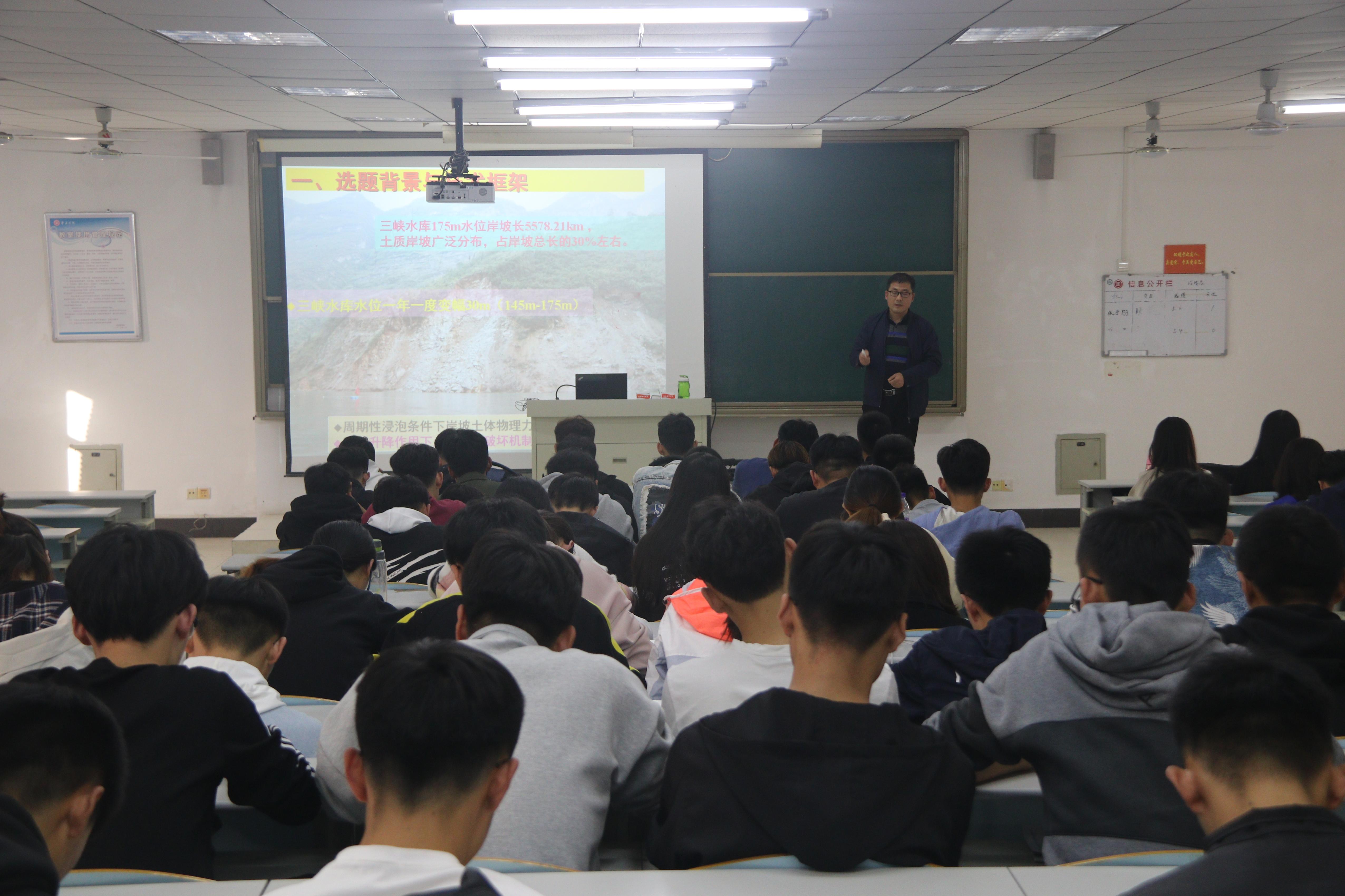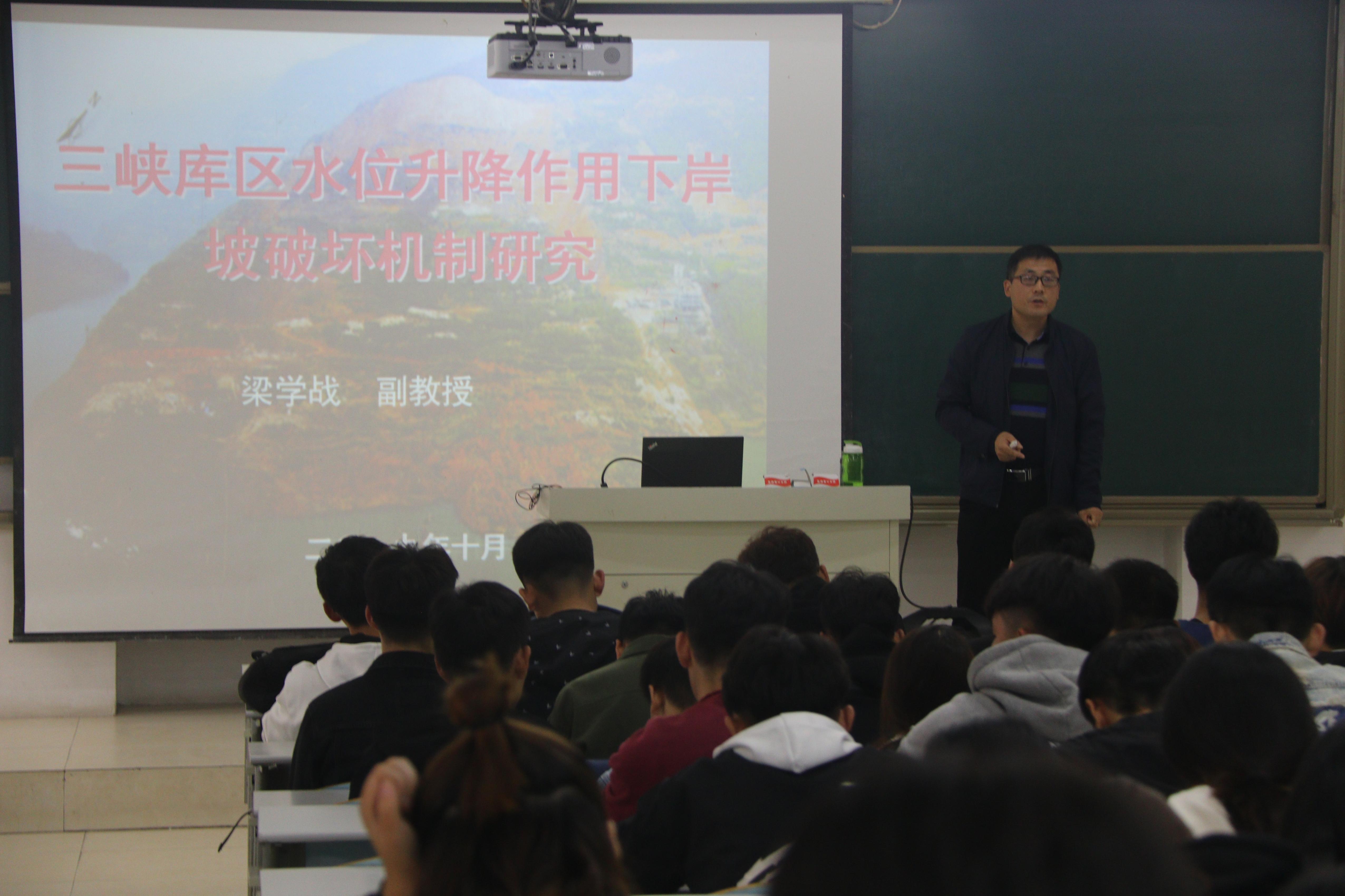 会上,梁学战副教授做了简单的自我介绍,重庆交通大学毕业、论文20余篇、授权专利4项、主持教育厅项目1项等经历都让在场的学生们为之赞叹。梁教授在“三峡库区水位升降作用下岸坡破坏机制研究”的报告中主要介绍了三峡库区水位升降的背景与技术框架、水位升降作用下岸坡破坏机制研究目前存在的问题。并且介绍了自己近期相关的研究成果,研究现况和遇到的关键问题。