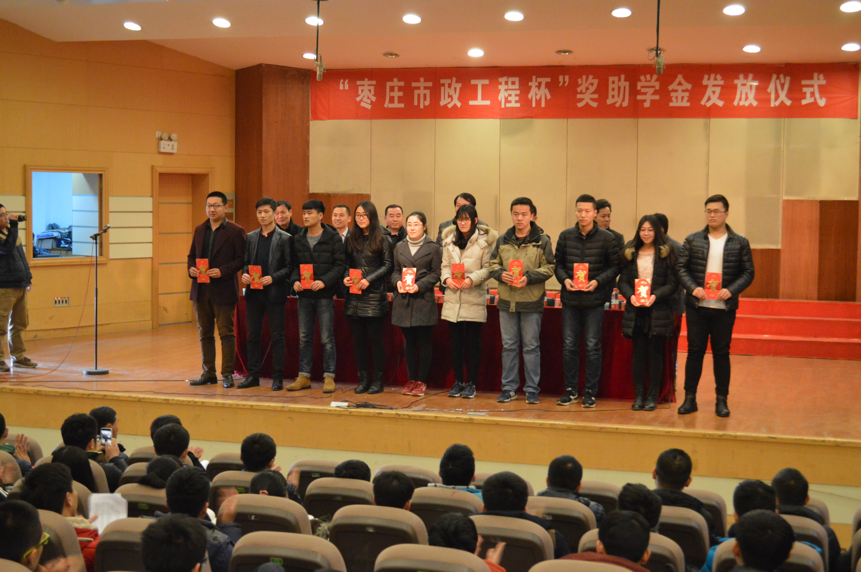 2016年1月12日上午10时,枣庄学院第一届“枣庄市政工程杯”奖助学金发放仪式在音乐厅隆重举行。校党委委员、党委副书记曾宪明,学生处处长王勤晓、市政工程公司赵峰总经理、夏士泉副总经理、校团委副书记袁俊现、YABO鸭脖官网党政负责人等出席资助仪式。
