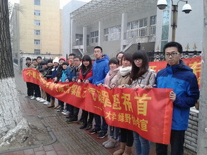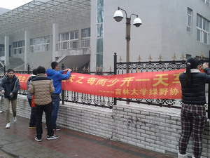 为提高威尼斯432888cam同学以及社会各界人士的低碳生活意识,减少环境污染,提高居民生活质量,威尼斯432888cam绿野环保协会在威尼斯432888cam团委的领导下,策划并开展了“低碳生活”系列之“每周少开一天车”低碳宣传活动。11月16日上午十一点,绿野协会12级和13级成员在长春市新疆街街边边拉起横幅,针对广大私家车车主开展宣传活动。
